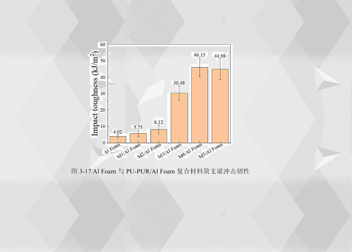 從圖3-17中可以看到,Al Foam的沖擊韌性為4.02 kJ/m2, M1/Al Foam的沖擊韌性為5.75kJ/m2, Al Foam增加了43.03%M2/Al Foam的沖擊韌性為8.12 kJ/m2, M1/Al Foam增加了41.21%M3/Al Foam的沖擊韌性為30.48kJ/m2M2/Al Foam增加了275.36%M4/Al Foam的沖擊韌性為46.15kJ/m2M3/Al Foam增加了51.41%M5/Al Foam的沖擊韌性為44.98kJ/m2,M4/Al Foam減少了2.52%。從沖擊韌性來看M3/Al FoamM4/Al FoamM5/Al Foam的沖擊韌性相對于Al FoamM1/Al FoamM2/Al FoamM3/Al Foam明顯更高。說明填充高聚脲成分共混樹脂到Al Foam中能極大加強其沖擊韌性,M4/Al FoamM5/Al Foam的沖擊韌性數值很接近,說明M4/Al FoamM5/Al Foam在抵抗簡支梁沖擊荷載時的能力相近。