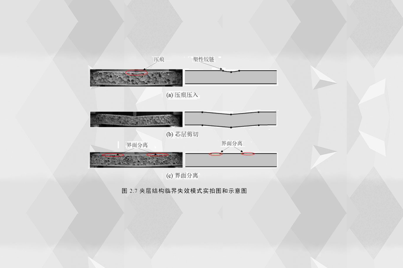 通過實驗觀察分析得出,泡沫夾層結構在彎曲工況下三種主要的臨界失效模式為壓痕壓入、芯層剪切和界面分離,如圖2.7所示。臨界失效模式壓痕壓入(IN)的主要特征是壓頭正下方部分夾層結構的上面板有鉸鏈并且附近的芯層有明顯的局部壓痕;通過2.7(a)可以觀測到,壓頭附近的上面板有三個鉸鏈,而在此時刻下面板的位移很小,基本可以忽略其位移量。如圖2.7(b)所示,臨界失效模式芯層剪切(CS) 的主要特征是上下面板位置平行,并且上下面板各有三個鉸鏈,鉸鏈的位置一個位于壓頭正下方,兩外兩個分別位于兩支撐端附近,該失效模式與Ashby等人在參考文獻中提到的ModeB類似。最后一種臨界失效模式為界面分離(DB),夾層結構膠粘劑的完整性確保了載荷在夾層結構各組成部分之間穩定傳遞;根據剪切力互等定理,在臨界失效模式發生之前,泡沫芯層受到的剪切應力等于膠粘劑的剪切應力,但在僅涉及由剪切應力引起的臨界失效模式的情況下,如果夾層結構受到的最大剪切應力超過膠粘劑所能承受的剪切強度,但小于芯層所能承受的剪切強度,則可能會發生界面分離(DB)。