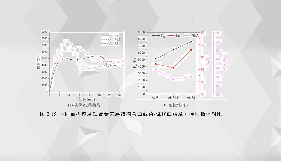 2.15(a)比較了不同面板厚度的鋁合金夾層結構載荷-位移曲線。AL-F的載荷-位移曲線為具有兩個峰值載荷的曲線類型Ⅱ,臨界失效模式為壓痕(IN),其第二個峰值力下降的原因是試樣位移達到10m左右時,夾層結構的一側發生下界面失效并隨后附帶泡沫芯層的剪切裂紋,導致載荷顯著下降,從而嚴重降低了結構的能量吸收能力。與AL-F1不同的是,AL-F1.5和AL-F2的臨界失效模式為芯層剪切(CS),兩者的載荷-位移曲線屬于曲線類型Ⅱ,載荷在達到臨界載荷后先下降,然后保持相對穩定。AL-F1.5和AL-F2的區別在于,前者在臨界載荷之后的5.3mm左右發生界面失效,使其載荷下降的速度比AL-F2快,而后者的后屈曲變形模式只是芯層剪切(CS)的演變。從臨界失效模式后的載荷變化趨勢來看,芯層剪切(CS)之后的載荷-位移曲線的變化趨勢明顯大于壓痕壓入(IN)的變化。
