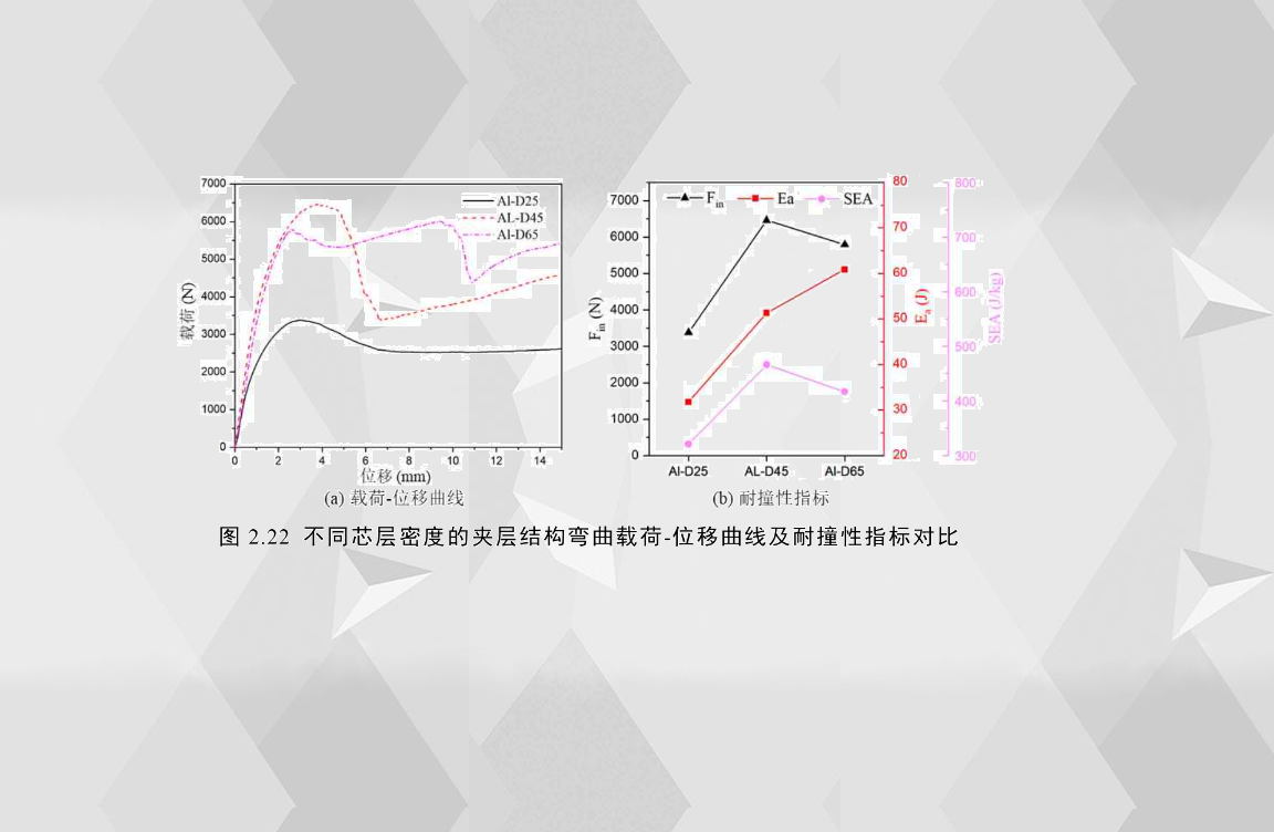對不同芯層密度的鋁合金夾層結構而言,其載荷-位移曲線和壓潰過程差別較大,如圖2.22(a)所示,芯層密度為0.25g/cm3的AL-D25和芯層密度為0.45g/cm3的AL-D45的載荷-位移曲線屬于類型I,芯層密度為0.65g/cm3的AL-D65的屬于類型Ⅱ,AL-D25的臨界失效模式為芯層剪切(CS),臨界載荷最小,由于其芯層密度較低,其后期主要失效形式還是以剪切裂紋為主,后屈曲壓潰力與臨界失效載荷相比相差不大。AL-D45的臨界失效模式也為芯層剪切(CS),其臨界載荷是三者中最大的,在臨界失效之后小段位移耦合了下界面失效,其載荷下降很快,嚴重降低了試件吸能。值得注意的是,雖然AL-D65的芯層密度比AL-D45的大,芯層可以承受的剪切強度大,但AL-D65的芯層的平均胞元大小比AL-D45的小,界面的強度比AL-D45的小,而在加載過程AL-D65的界面能承受的剪切強度比芯層能承受的剪切強度小,所以發生了界面分離的臨界失效模式,使得AL-D65的臨界載荷反而比后者的小。雖然AL-D65在彎曲位移2.5mm左右處發生界面失效,但其失效界面的位置為上膠層,位移相對較小,試件整體的承載能力還很強,所以其載荷下降的幅度比例相對AL-H10更小,所以前者的吸能效果更佳。